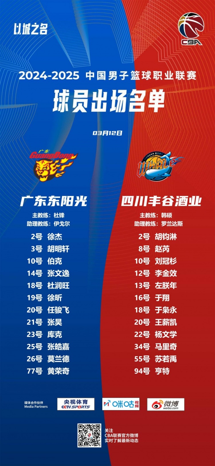 2025-03-13 00:55:33廣東VS四川大名單:廣東三外援領(lǐng)銜 四川薩姆納缺戰(zhàn)
