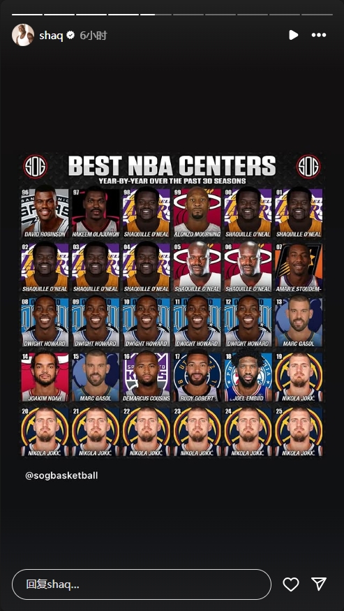 2025-03-13 00:55:55奧尼爾曬過去30年最佳中鋒:自己9年8度上榜 約基奇統(tǒng)治最近7年