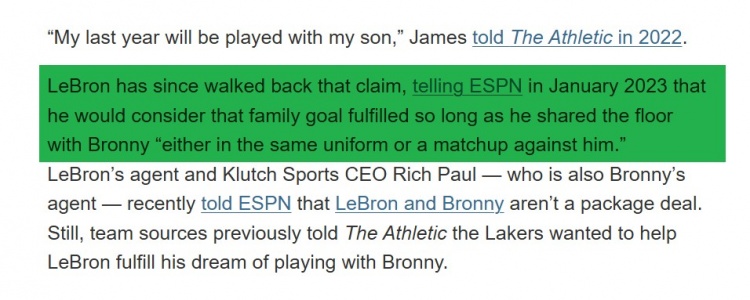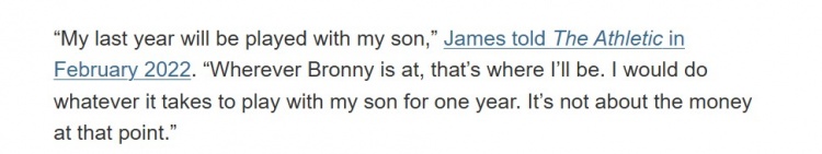 2022年2月,詹姆斯在接受The Athletic采訪時第一次談到父子同臺的愿望:“我在生涯最后一年會和我兒子一起打球,無論布朗尼在哪里,我都會去那個地方。我愿意做任何事情來實(shí)現(xiàn)與我的兒子一起打球一年。屆時錢也就不重要了?!?/p>