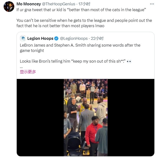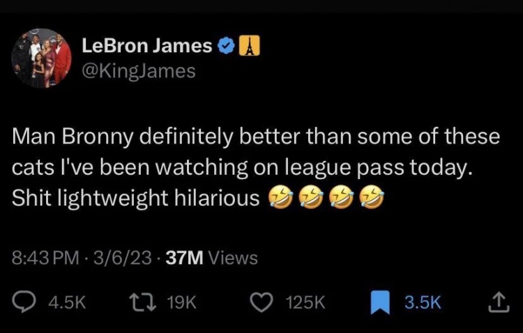 在2023年3月6日,詹姆斯發(fā)推寫道:“天啊,布朗尼絕對強(qiáng)于今天我在聯(lián)盟通(注:NBA官方比賽直播服務(wù))上看到的一些阿貓阿狗。這場面真的有點(diǎn)好笑????????????????”