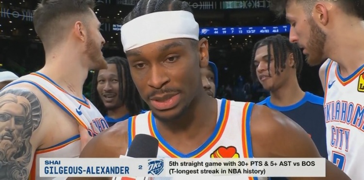 2025-03-13 17:17:52亞歷山大對(duì)陣綠軍連續(xù)5場(chǎng)拿下至少30分5助攻 追平歷史紀(jì)錄!
