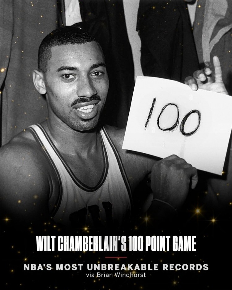 我們剛剛度過了這一壯舉的63周年紀(jì)念日(1962年3月2日),而這一紀(jì)錄極有可能在100周年時依然無人打破。張伯倫在那個賽季早些時候曾單場得到78分(那場比賽湖人的埃爾金-貝勒得到63分,最終張伯倫所在的球隊在加時賽中輸給了湖人),并在接下來的賽季中有兩場70+的表現(xiàn)。那場100分比賽的關(guān)鍵在于他的罰球表現(xiàn),張伯倫罰球線上32罰28中,命中率高達87.5%。而張伯倫職業(yè)生涯的罰球命中率僅為51%,那晚的罰球表現(xiàn)無疑是他在那個神奇賽季中最出色的一次。科比在2006年曾單場得到81分,是NBA歷史上第二高的單場得分,而且他比張伯倫少出手了17次(科比46次出手,張伯倫63次)。自科比以來,只有東契奇(73分)、米切爾(71分)、利拉德(71分)、布克(70分)和恩比德(70分)曾單場得分超過70分。
