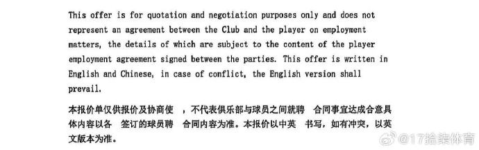 二 多家俱樂部對(duì)哈雷爾感興趣并進(jìn)行了談判,其間另一家中方經(jīng)紀(jì)公司在浙江稠州銀行俱樂部與哈雷爾的談判過程中簽訂了一份報(bào)價(jià)單,其中明確約定“該報(bào)價(jià)單僅供報(bào)價(jià)和協(xié)商使用,不代表球員與俱樂部完成聘用合同簽約?!薄@也是浙江稠州銀行俱樂部多次公告中含糊其辭提及的“簽約”。最后,在多家俱樂部中談判協(xié)商中球員哈雷爾于二月十日選擇了簽約新疆廣匯俱樂部,三方按中國(guó)籃協(xié)和CBA公司要求簽訂了標(biāo)準(zhǔn)合同并在中國(guó)籃協(xié)完成了經(jīng)紀(jì)人備案。