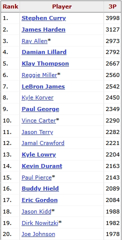2025-03-14 20:40:31NBA歷史三分榜:庫(kù)里4000記斷檔第一 哈登3124第二 詹姆斯第七