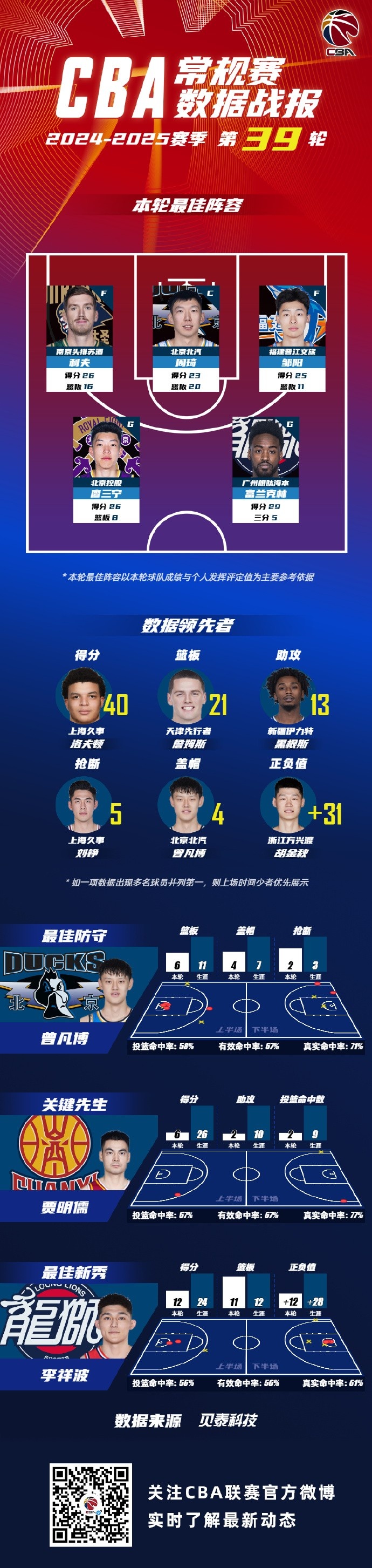 第39輪最佳防守球員由來自北京北汽的曾凡博獲得;