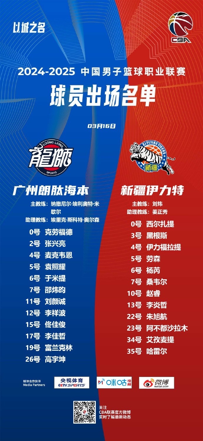 2025-03-16 22:32:09新疆隊(duì)VS廣州隊(duì)大名單:哈雷爾在列 齊麟缺陣 趙睿&阿不都領(lǐng)銜
