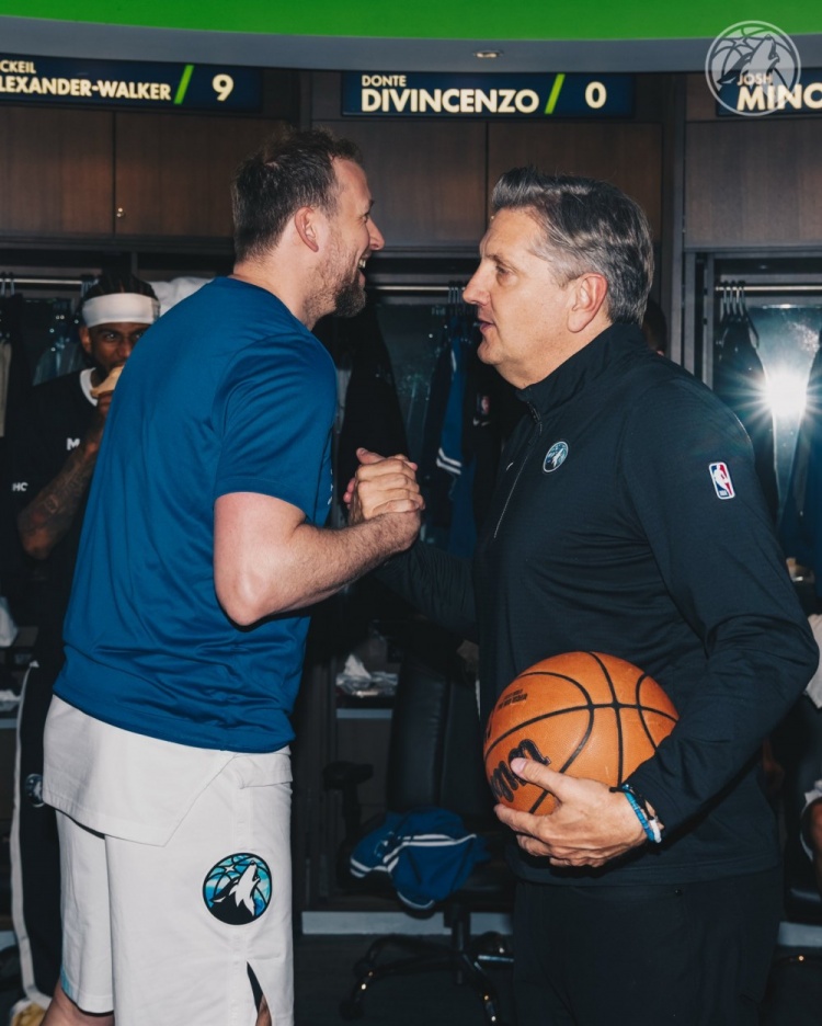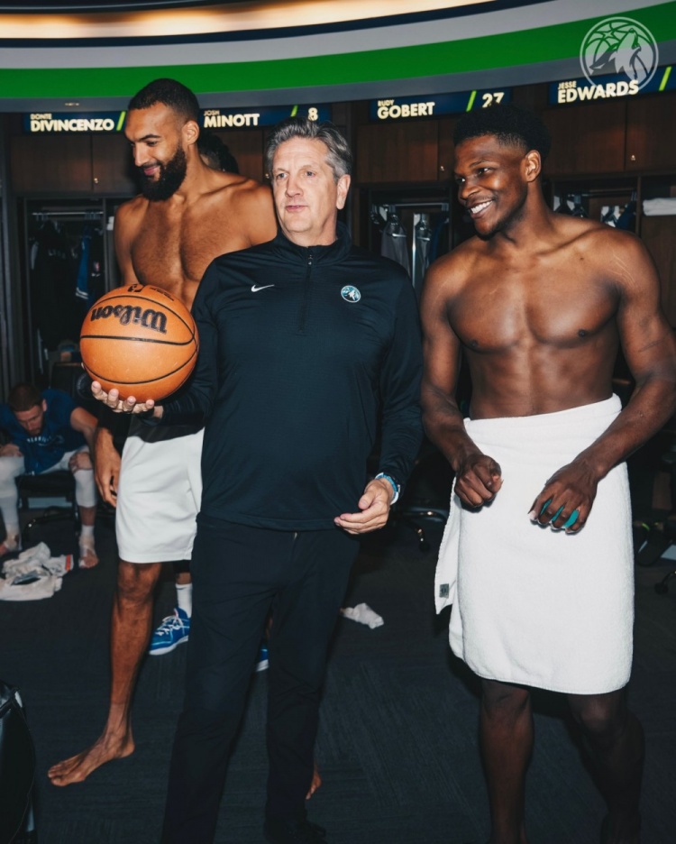 2025-03-17 10:50:56森林狼更衣室祝賀芬奇200勝:拿到比賽用球 華子戈貝爾裹浴巾合影