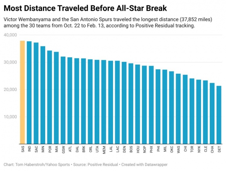 全明星前旅行最遠距離:根據(jù)Positive Residual的追蹤,文班亞馬和馬刺從10月22日到2月13日之間,旅行的總距離(37,852英里)在30支球隊中排名第一。