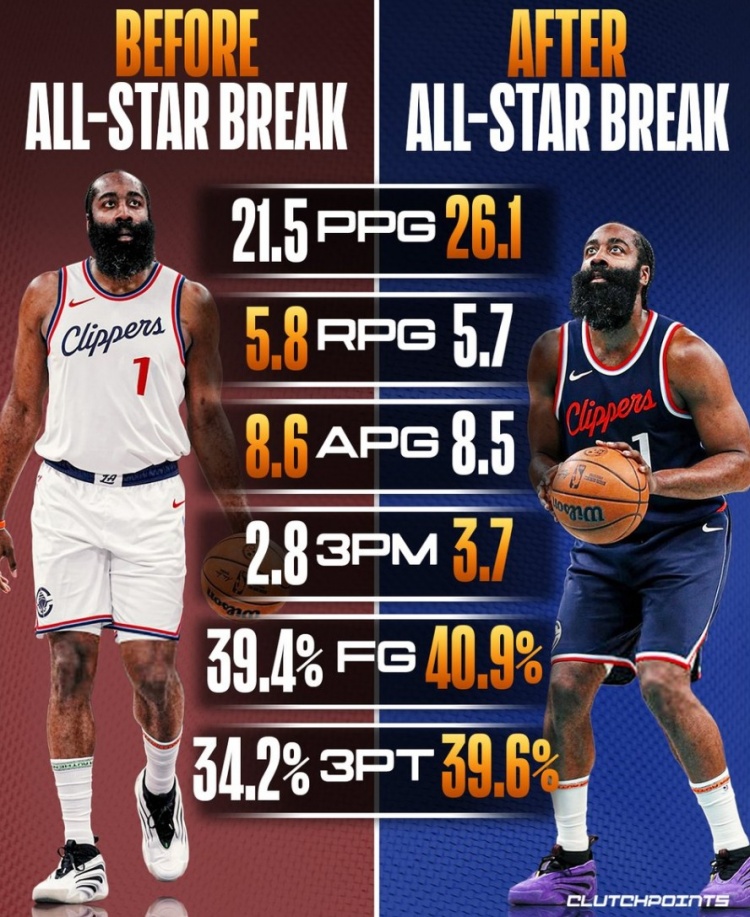2025-03-19 11:30:52哈登全明星后場(chǎng)均26.1分5.7板8.5助 得分命中率皆有明顯上漲