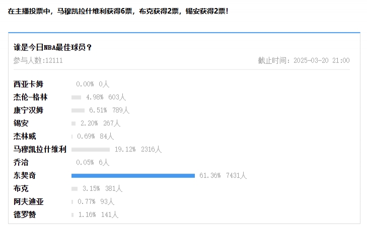 在主播投票中,馬穆凱拉什維利獲得6票,布克獲得2票,錫安獲得2票!