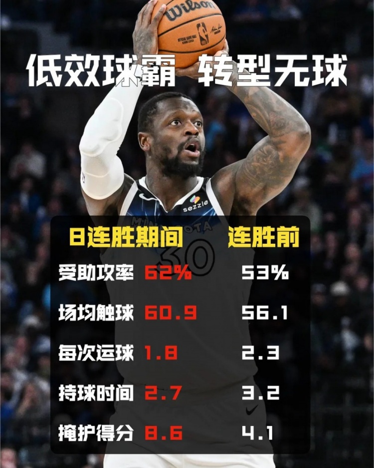 此前,蘭德爾每次觸球要運2.31次,并且球要在他手里停留平均3.29秒。而在開啟連勝后,蘭德爾在觸球次數(shù)增加的前提下,這兩項數(shù)據(jù)分別減少至1.76和2.69。