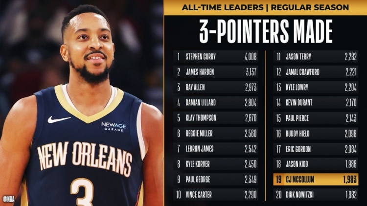 2025-03-20 22:01:50生涯能到多少?CJ三分命中數(shù)1983 超越諾維茨基升至歷史第19