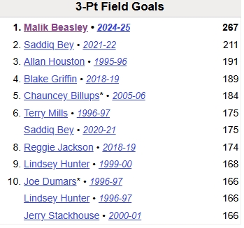 2025-03-20 22:02:49比斯利本賽季突破270記三分球 活塞隊史首位達(dá)成此成就的球員