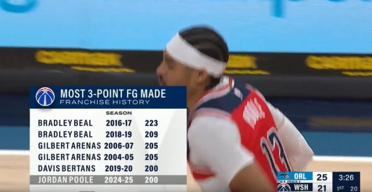 首節(jié)比賽,普爾命中2記三分,本賽季他已經(jīng)投進(jìn)了200記三分,距比爾保持的奇才隊(duì)史最高紀(jì)錄還差23記。
