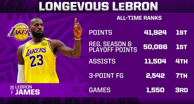 2025-03-23 23:06:45長青!詹姆斯今日賽前41924分歷史第一 總助攻第4&總?cè)謹(jǐn)?shù)第7
