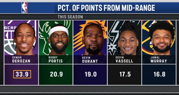 2025-03-23 23:08:15經(jīng)典永不過時(shí)!本賽季中距離得分占比德羅贊33.9%第一&杜蘭特第三