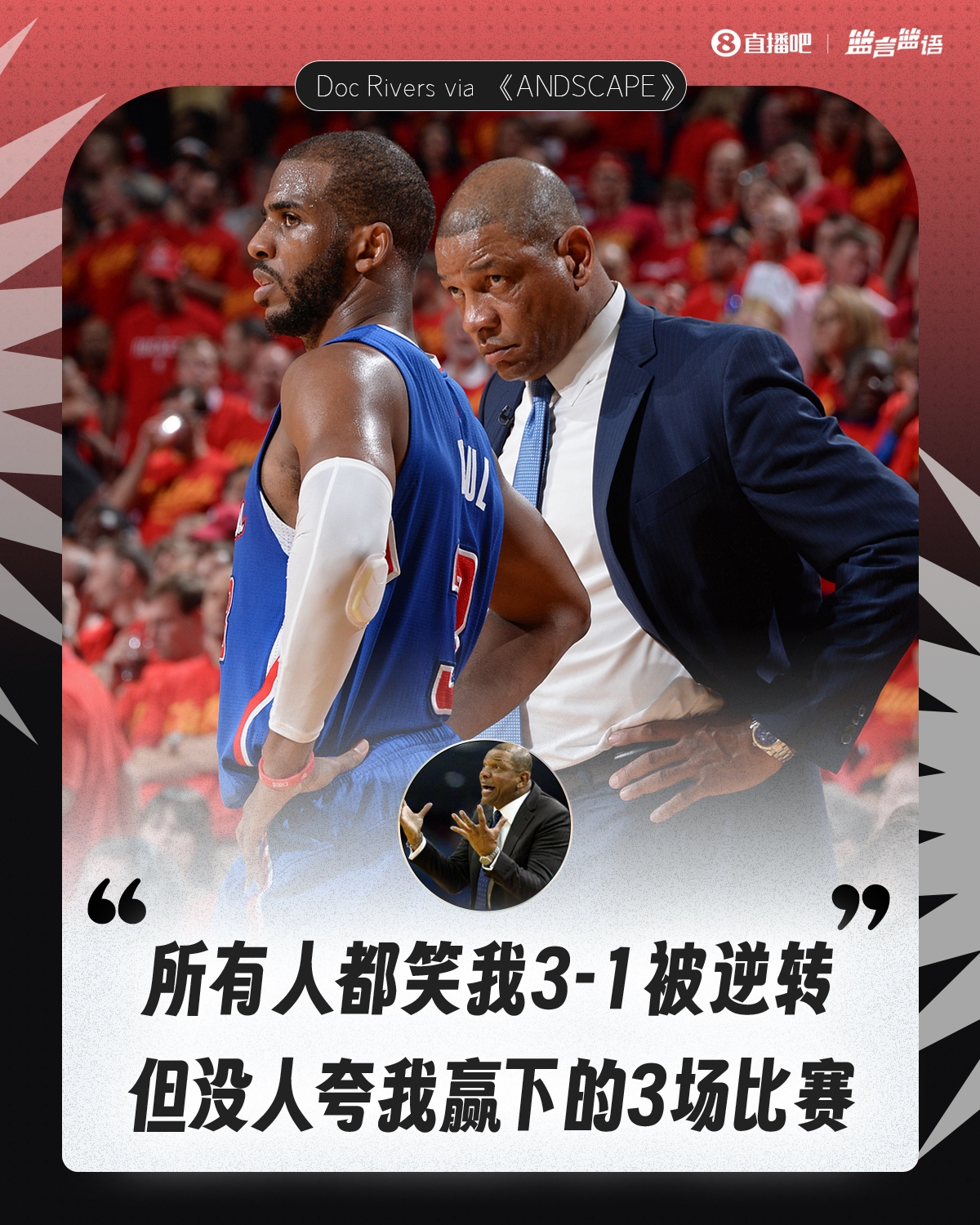 在談到自己飽受詬病的“系列賽多次3比1領先被翻盤”的話題時,里弗斯坦然表示:“我曾帶領一支排名第8的球隊3比1領先。在快船的那次是唯一一次讓勝利溜走了,沒有人講出真實的故事,沒人意識到保羅當時拖著一條傷腿在場上奔跑。這在某種程度上是不公平的,我贏得3場勝利沒有得到足夠的認可,大家只記住了輸?shù)舻谋荣悺N铱偸钦f,‘如果我們6場內(nèi)輸給火箭會怎樣?那就沒人在意了。’”