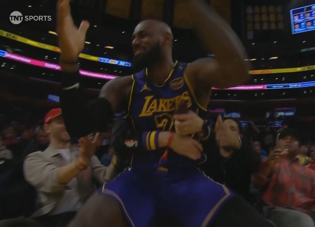 2025-02-26 16:18:22詹姆斯快攻上籃飛出場外摔到場外觀眾席 裁判未響哨&老詹十分不滿