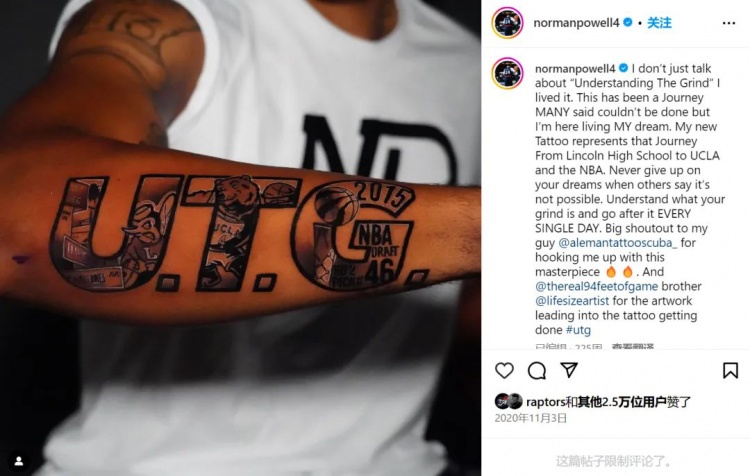 “Understand the Grind (理解磨礪)”一直都是諾曼-鮑威爾所秉持的人生信條,它以“UTD”的形式紋在了鮑威爾投籃手的小臂上,陪他一起面對所有挑戰(zhàn)。