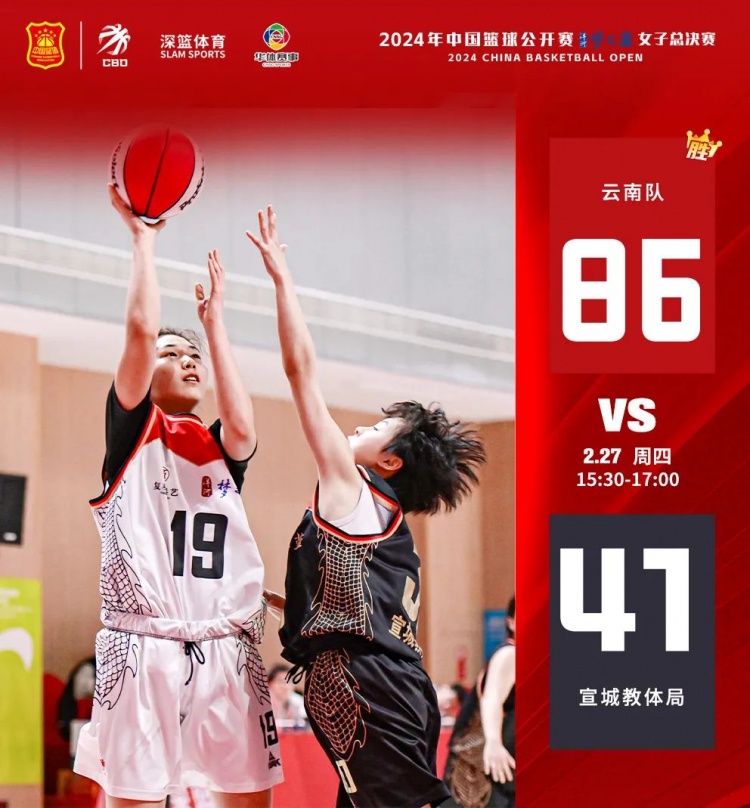 兩連勝的云南隊,本輪對陣實力相對較弱的宣城教體局。上半場,云南隊打出一波11-0的得分潮。落后的宣城教體局在技術上稍顯稚嫩,半場結束,云南隊43-14宣城教體局。下半場,宣城教體局命中率有所提高,但面對云南隊還是存在很大差距,最終,云南隊86-41戰(zhàn)勝宣城教體局。