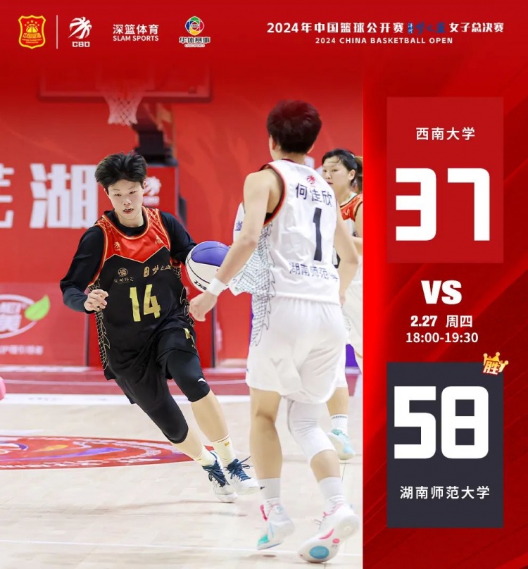 上半場,在開局短暫僵持后,湖南師范大學開始進攻,15號劉嘉芳后場籃板拼搶積極,6號沈思榆、1號何佳欣兩分命中,湖南師范大學22-8領先西南大學。次節(jié)湖南師范大學繼續(xù)高歌猛進,多次搶斷快攻打成。半場結束,湖南師范大學36-20領先。下半場,西南大學手感欠佳,兩節(jié)只得到17分,最終湖南師范大學58-37戰(zhàn)勝西南大學。