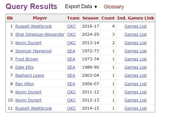 2025-03-04 22:43:40亞歷山大單賽季4次50+ 追平MVP賽季威少并列隊史最多
