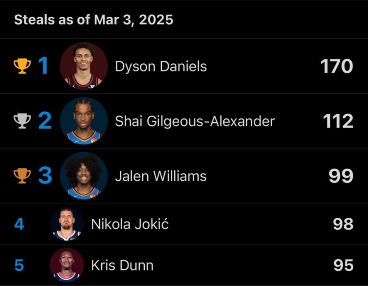 2025-03-04 22:44:34本賽季總搶斷數(shù)前5:丹尼爾斯170次遙遙領(lǐng)先 SGA第2 約基奇第4