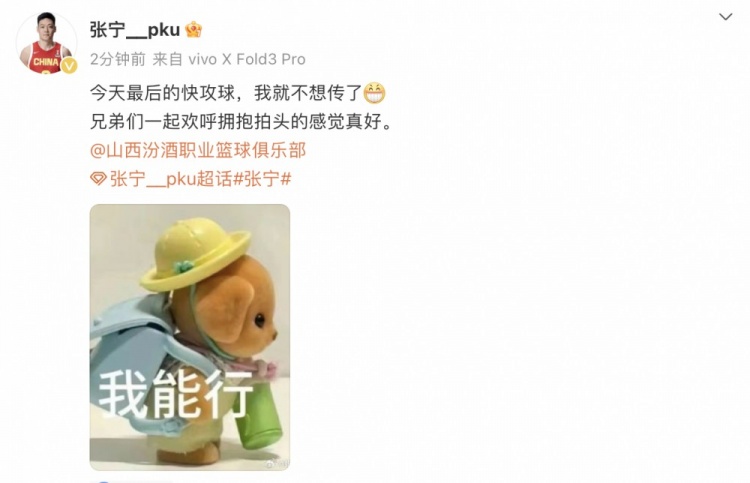 賽后,張寧更新社媒寫道:“今天最后的快攻球,我就不想傳了????兄弟們一起歡呼擁抱拍頭的感覺真好?!?/p>