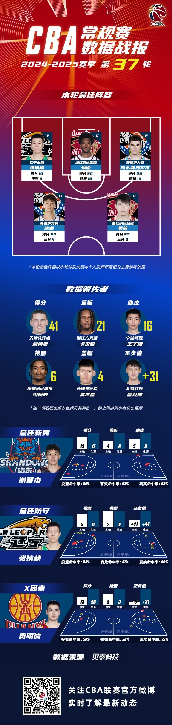2025-03-09 15:22:44常規(guī)賽第37輪最佳陣容:張鎮(zhèn)麟&吳前&瓊斯&趙睿&阿不都