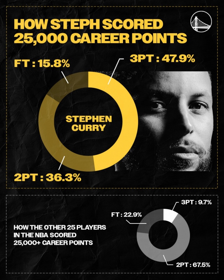 2025-03-10 12:36:39獨樹一幟!庫里25000分中得分方式占比:三分47.9% 罰球僅15.8%