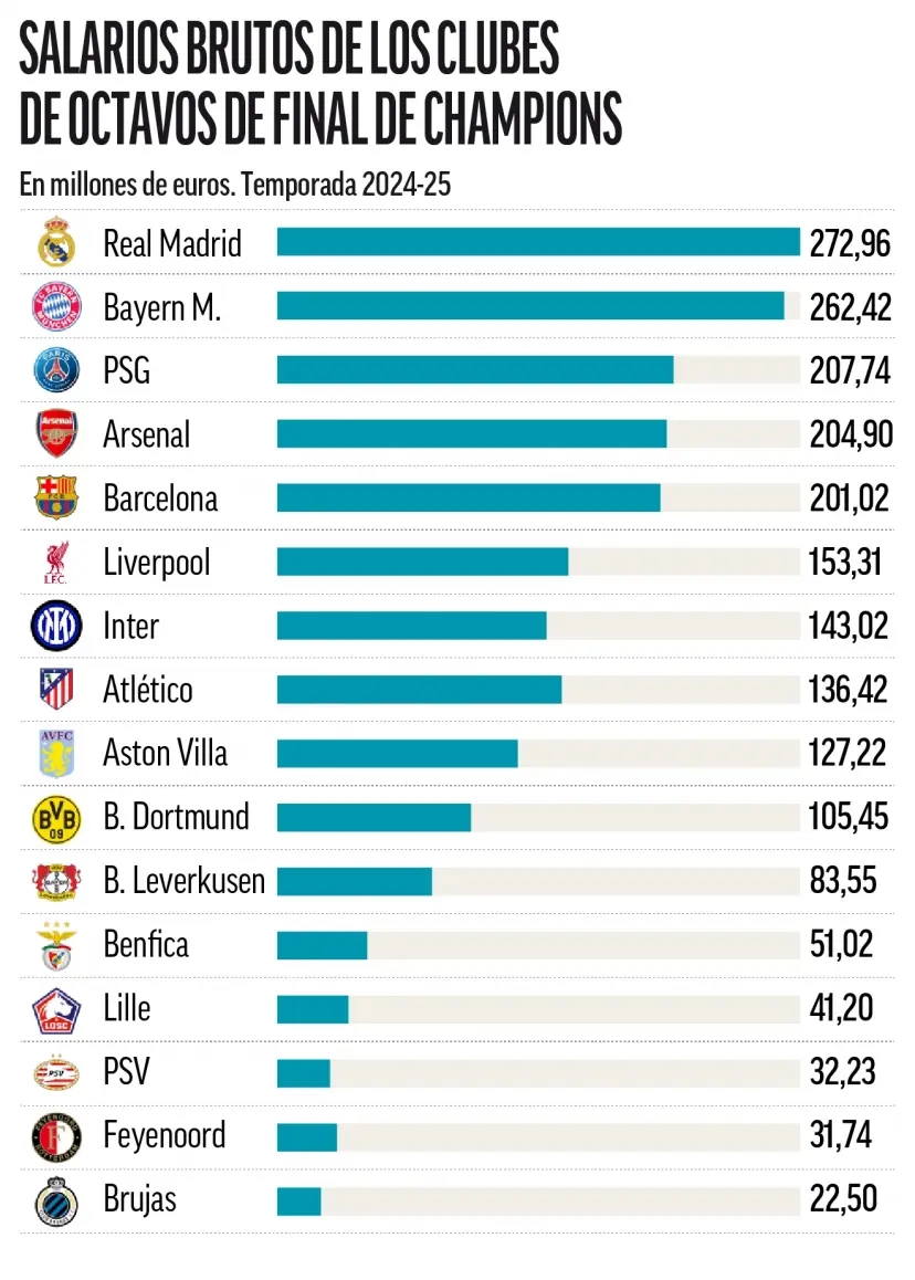 盡管經(jīng)濟實力并不一定保證競技成功——過去十年曼聯(lián)便是例證——但財務(wù)差距顯而易見。八強俱樂部的平均年薪支出為1.298億歐元,但最高支出者皇馬(2.729億歐元)與最低支出者布魯日(2250萬歐元)之間的差距達(dá)到12比1。