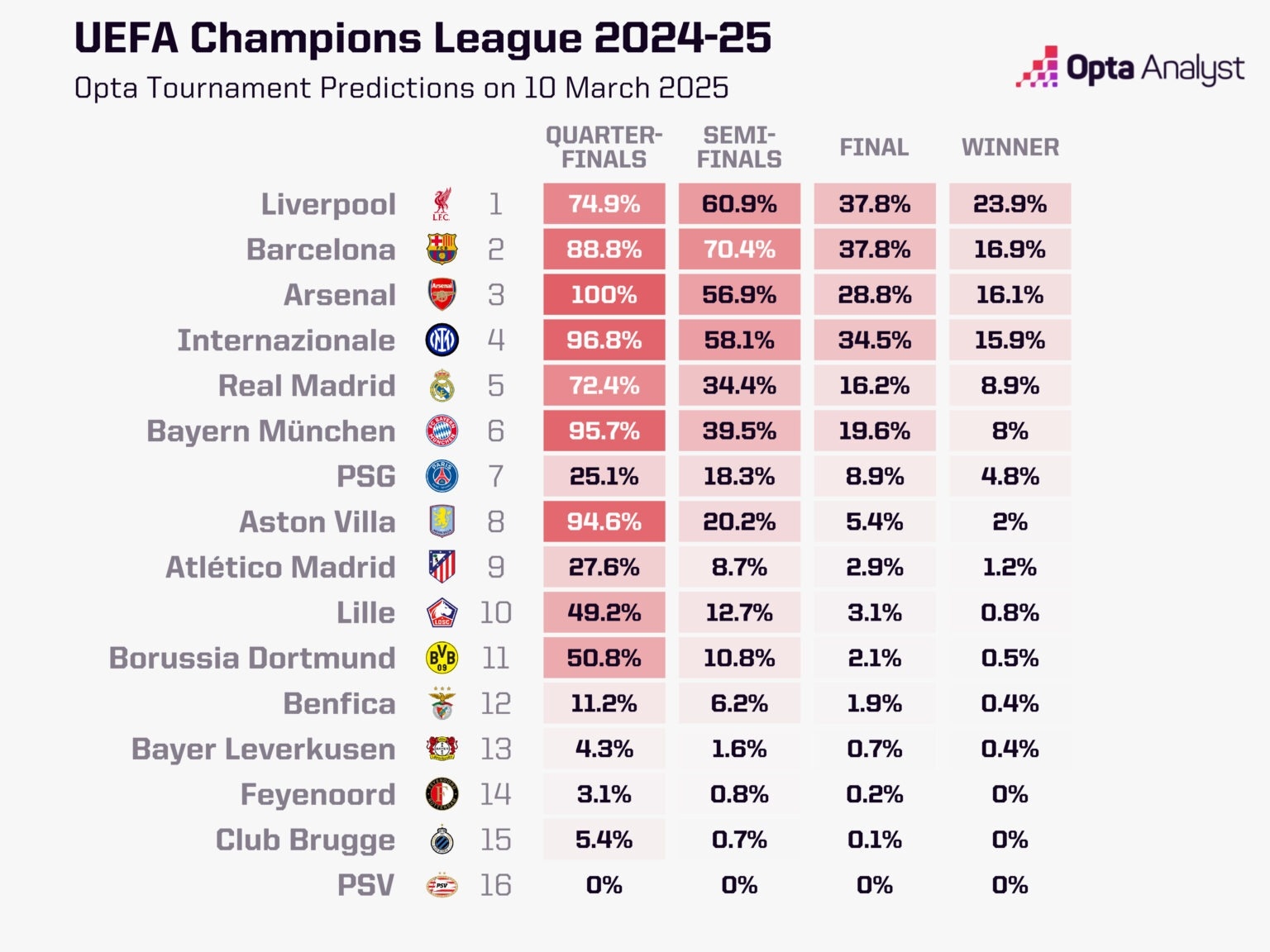 03月11日訊 歐冠1/8決賽次回合今夜明晨開打,半數(shù)8強(qiáng)隊(duì)伍將在一晚之內(nèi)決出。數(shù)據(jù)機(jī)構(gòu)Opta對(duì)歐冠1/8決賽次回合做出了預(yù)測(cè)。