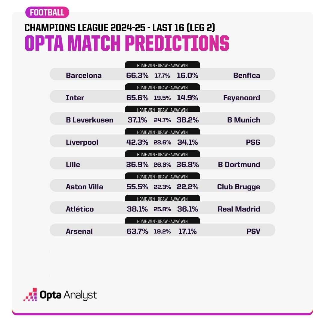 Opta預(yù)測(cè)歐冠1/8決賽次回合勝率: