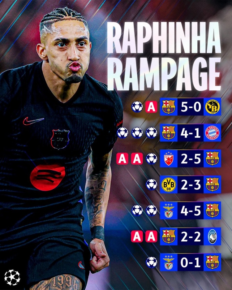 2025-03-11 23:40:40拉菲尼亞本賽季9場歐冠有7次參與進(jìn)球,共計(jì)9球5助攻&戰(zhàn)拜仁戴帽