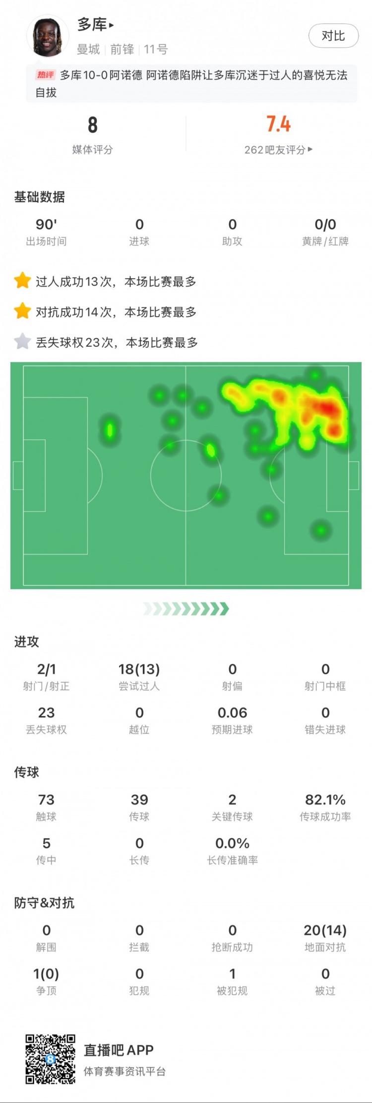 2025-02-24 16:11:19多庫本場數(shù)據(jù):13次成功過人,14次贏得對抗,23次丟失球權均最多