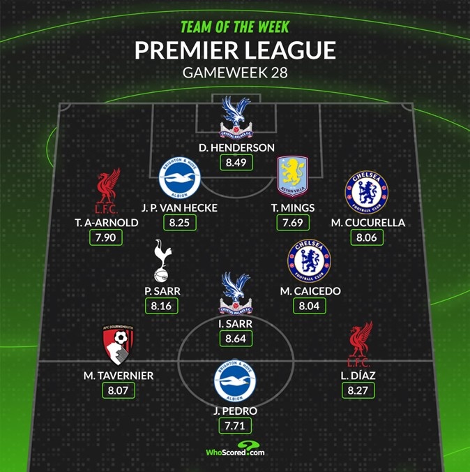 3月11日訊 英超第28輪聯(lián)賽已經(jīng)完賽,whoscored也評出了本輪聯(lián)賽最佳陣容,利物浦和切爾西各2人入圍。