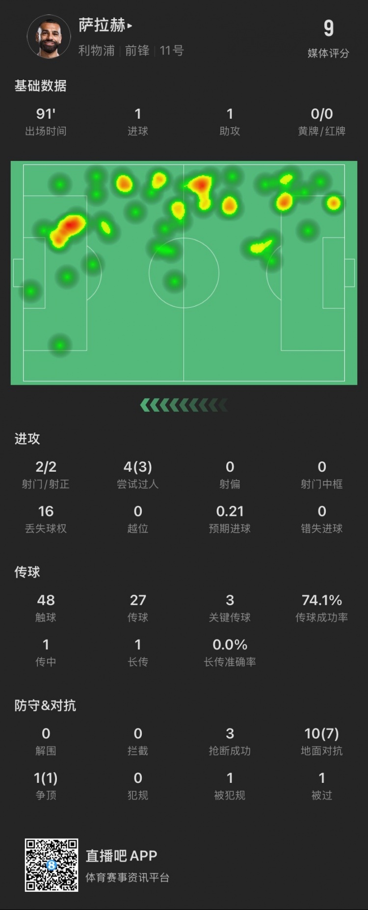 2025-02-24 16:11:26薩拉赫本場:傳射建功!4次過人成功3次,獲評9分全場最高