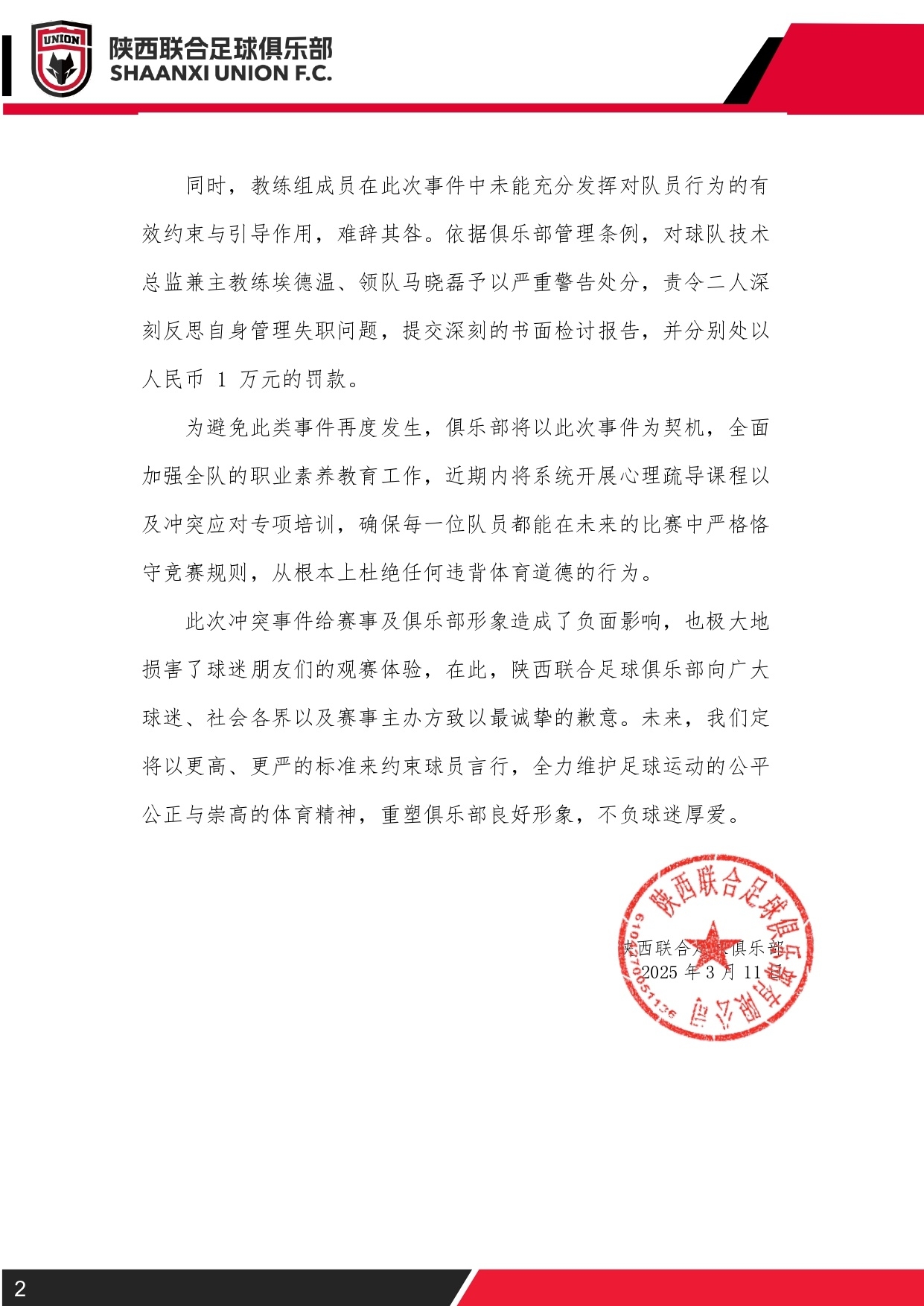 此次沖突事件給賽事及俱樂(lè)部形象造成了負(fù)面影響,也極大地?fù)p害了球迷朋友們的觀賽體驗(yàn),在此,陜西聯(lián)合足球俱樂(lè)部向廣大球迷、社會(huì)各界以及賽事主辦方致以最誠(chéng)摯的歉意。未來(lái),我們定將以更高、更嚴(yán)的標(biāo)準(zhǔn)來(lái)約束球員言行,全力維護(hù)足球運(yùn)動(dòng)的公平公正與崇高的體育精神,重塑俱樂(lè)部良好形象,不負(fù)球迷厚愛。