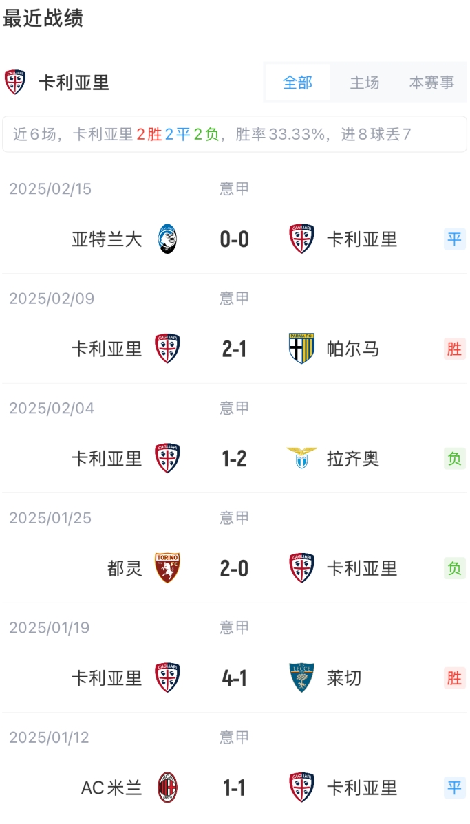 卡利亞里首發(fā):25-卡普里萊、28-扎帕、26-米納、6-魯佩托、3-奧杰洛、19-佐爾泰亞、8-阿多博、29-馬庫姆布、14-戴奧拉、97-奧利奇、91-皮科利