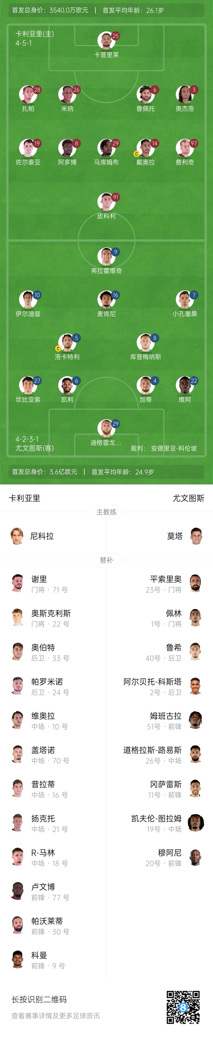 2月24日訊 意甲第26輪,卡利亞里主場迎戰(zhàn)尤文比賽即將打響。賽前首發(fā)出爐。