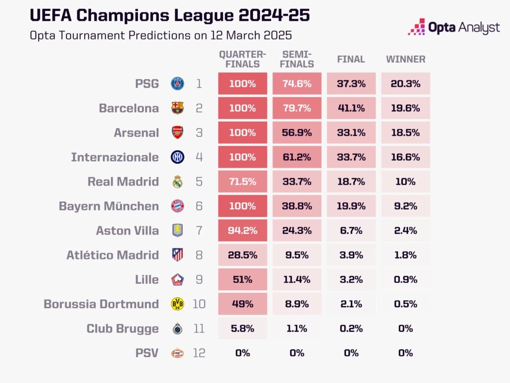 2025-03-12 21:54:47最大熱門(mén)出局!opta最新歐冠奪冠概率:巴黎第1 巴薩第2 皇馬第5