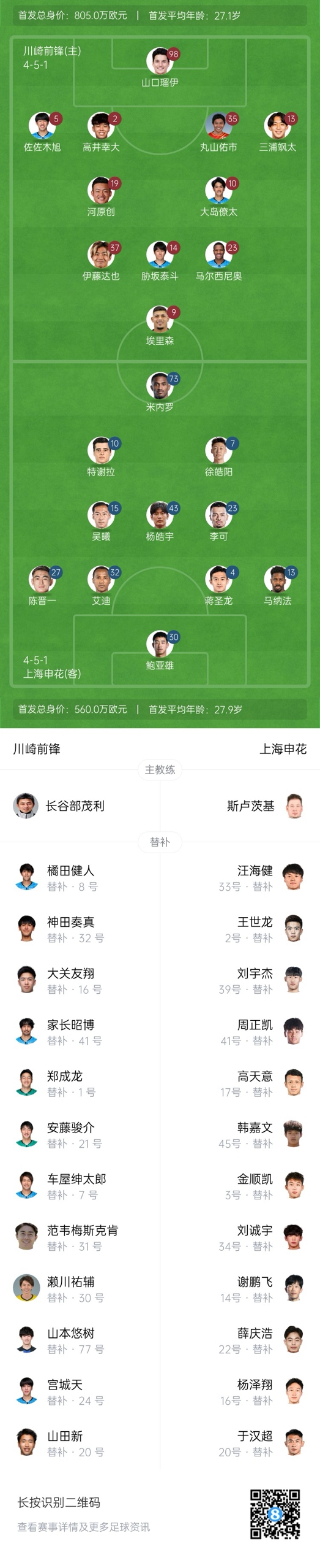 川崎前鋒替補:1-鄭成龍(F)、21-安藤俊介、7-車屋紳太郎、8-橘田健人、16-大關友翔、20-山田新、24-宮城天、30-瀨川祐輔、31-范韋梅斯克肯-際、32-神田奏真、41-家長昭博、77-山本悠樹