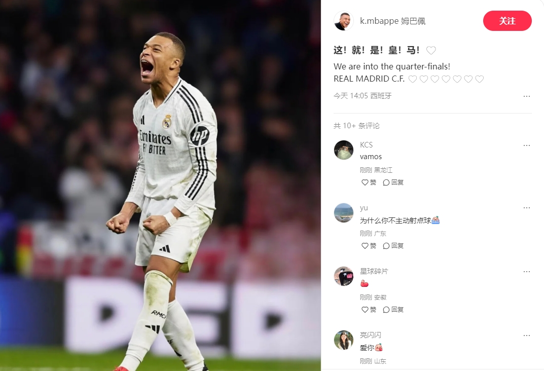 2025-03-13 14:29:14很興奮!姆巴佩更新個(gè)人中文社媒:這!就!是!皇!馬!
