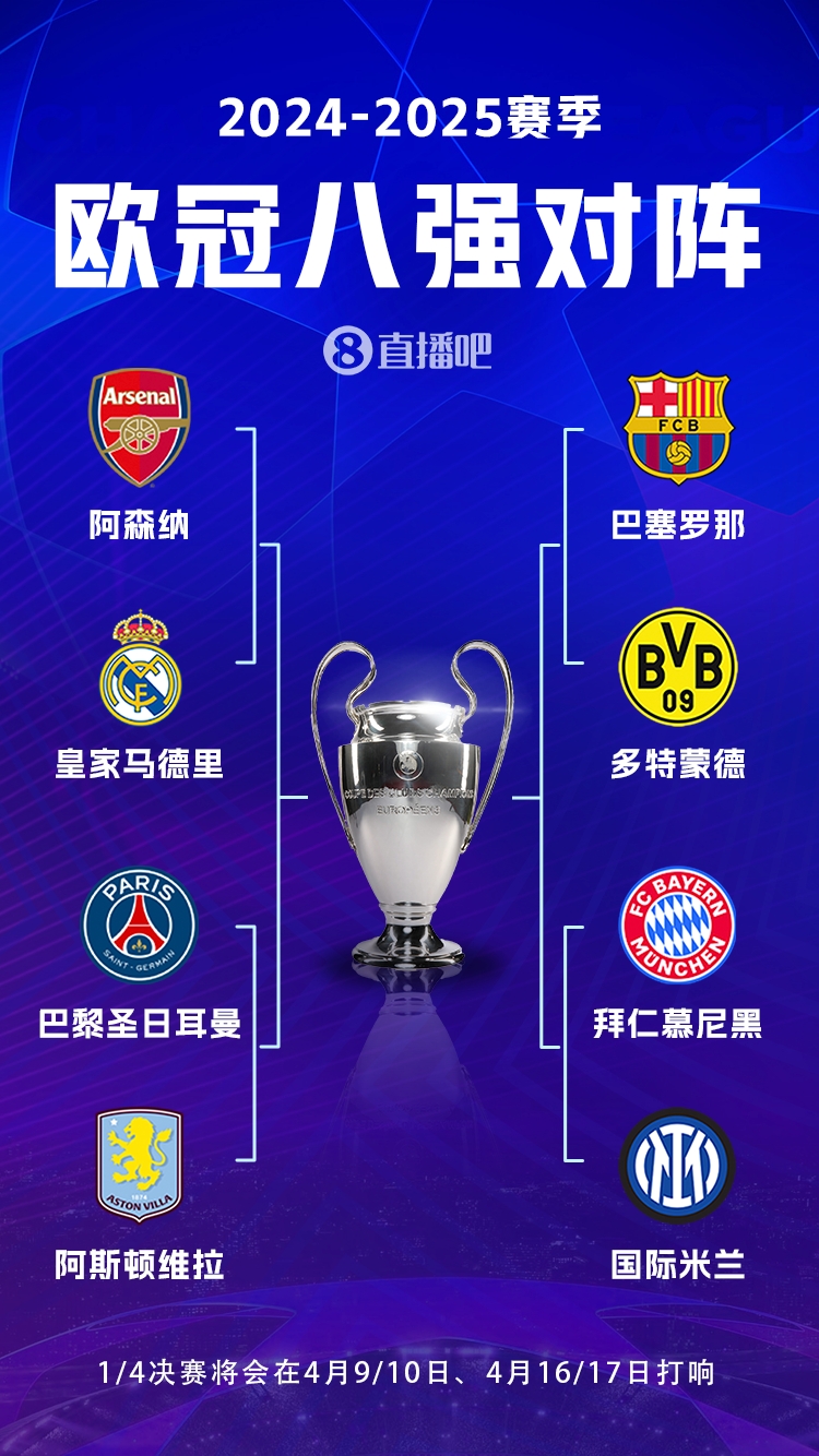 2025-03-13 14:38:29歐冠1/4決賽賽程:阿森納對皇馬下月9號打響,巴薩4月10日出戰(zhàn)