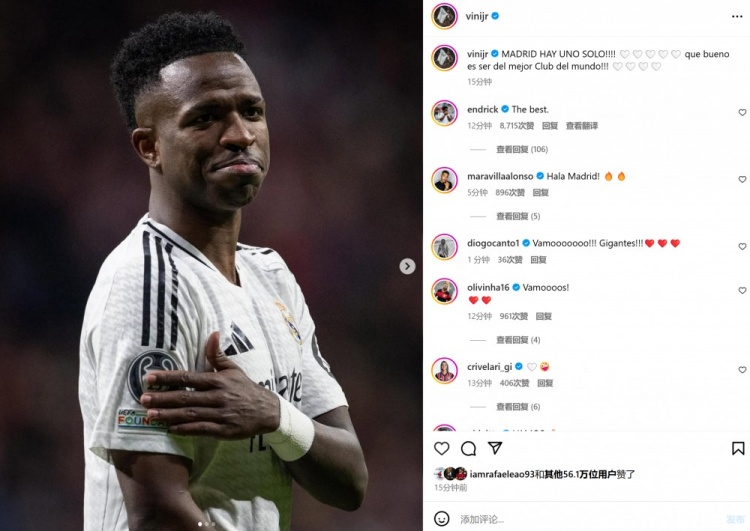 2025-03-13 14:39:56維尼修斯社媒發(fā)文:馬德里只有唯一,作為世界最佳球隊一員太棒了