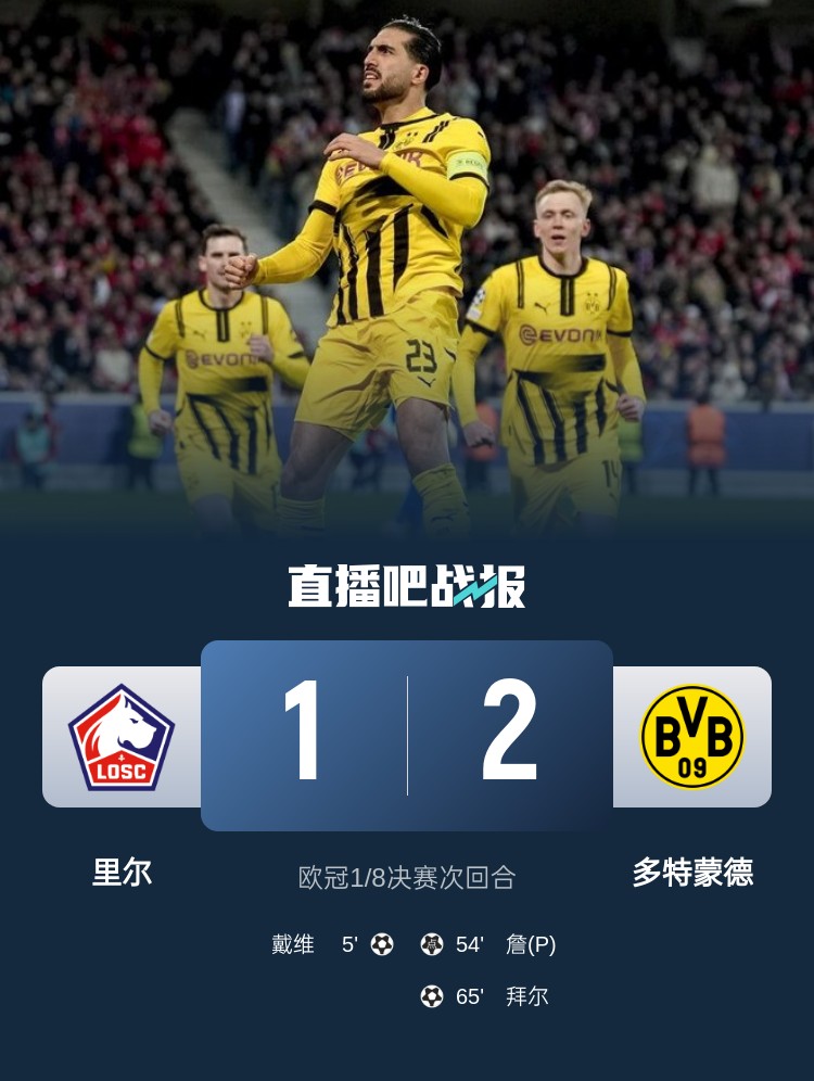 歐冠1/8決賽次回合,多特客場2-1里爾,總比分3-2淘汰對手。上半場,科貝爾黃油手送禮,戴維破門,格羅斯單刀被擋,切瓦利爾三連撲;下半場,吉拉西造點,埃姆雷-詹點球扳平,拜爾爆射反超。