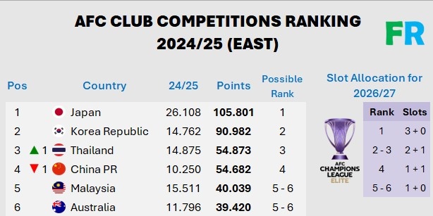 馬來超 40.039分 2026-27賽季亞冠精英聯(lián)賽名額1個(gè)