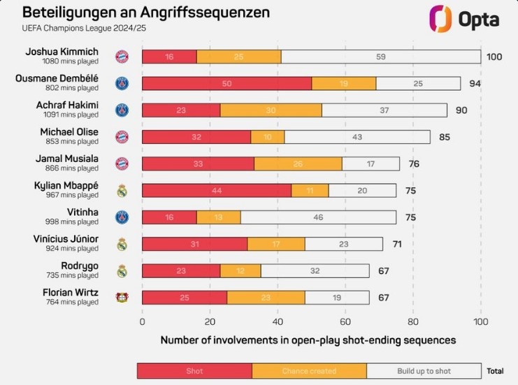2025-03-14 11:48:27基米希本賽季歐冠100次參與形成射門的進(jìn)攻,領(lǐng)跑所有球員