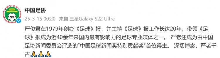 2025-03-15 04:43:13中國(guó)足協(xié)發(fā)文悼念《足球》報(bào)創(chuàng)刊人嚴(yán)俊君:深切悼念,嚴(yán)老千古