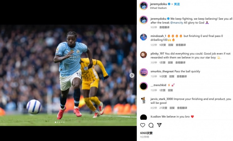 不過他依然展現(xiàn)出良好心理素質(zhì),在賽后曬出自己的比賽照并鼓勵(lì)道:“我們繼續(xù)戰(zhàn)斗,我們依然堅(jiān)信!和大家在國家隊(duì)比賽周之后再見!@曼城俱樂部。榮耀歸于上帝?!?/p>